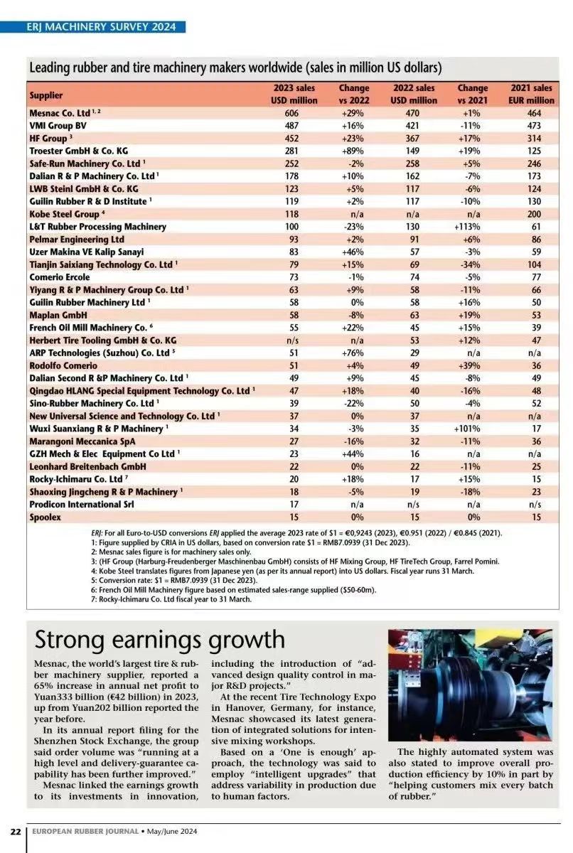 近日,歐洲橡膠雜志(European Rubber Journal) 5/6月刊,公布了2023年全球橡膠機械行業(yè)企業(yè)的銷(xiāo)售收入排名,軟控(MESNAC)蟬聯(lián)第一。