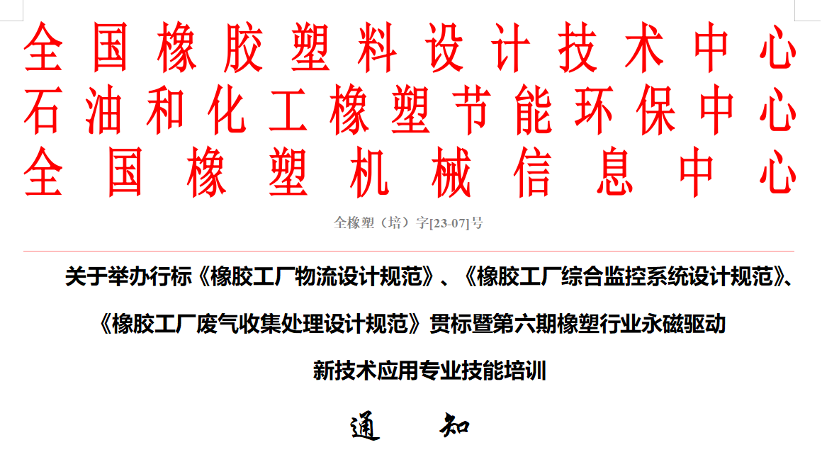 培訓通知|三項行標貫標暨“第六期橡塑行業(yè)永磁驅動(dòng) 新技術(shù)應用專(zhuān)業(yè)技能培訓”通知各相關(guān)單位 : 為貫徹落實(shí)工信部最新頒布并于2022年10月1日實(shí)施的行標《橡膠工廠(chǎng)物流設計規范》HG/T22819-2022、《橡膠工廠(chǎng)綜合監控系統設計規范》HG/T 22818-2022、《橡膠工廠(chǎng)廢氣收集處理設計規范》HG/T 22822-2021,加快推進(jìn)橡膠工業(yè)永磁驅動(dòng)新技術(shù)應用,由全國橡塑中心特聘行業(yè)標準編制專(zhuān)家和資深專(zhuān)家授課,對從事橡膠行業(yè)專(zhuān)業(yè)技術(shù)人員、節能環(huán)保技術(shù)人員、控制專(zhuān)業(yè)人員以及制造企業(yè)設備研設人員開(kāi)展新技術(shù)應用交流與培訓,現將有關(guān)事項通知如下: 一、主辦單位 主辦單位:全國橡膠塑料設計技術(shù)中心 全國橡塑機械信息中心 石油和化工橡塑節能環(huán)保中心 協(xié)辦單位:上海新時(shí)達機電科技有限公司 二、培訓內容 1. 行標《橡膠工廠(chǎng)物流設計規范》HG/T 22819-2022、《橡膠工廠(chǎng)綜合監控系統設計規范》HG/T 22818-2022、《橡膠工廠(chǎng)廢氣收集處理設計規范》HG/T 22822-2021貫標及案例分析; 2. 橡膠工廠(chǎng)節能、環(huán)保技術(shù)交流; 3.配套產(chǎn)品推薦; 4.永磁技術(shù)與應用廠(chǎng)家使用情況介紹。 三、培訓對象 主要針對在橡膠行業(yè)(輪胎、膠管、膠帶等)科研、設計、生產(chǎn)及科研院校及橡膠機械制造企業(yè)從事自控、物流、環(huán)保工作的專(zhuān)業(yè)技術(shù)人員、企業(yè)管理人員及其他相關(guān)從業(yè)人員。 四、培訓結業(yè)后頒發(fā)培訓合格證書(shū) 請參加培訓人員報名時(shí)同時(shí)發(fā)送一張電子版兩寸白底免冠證件照。 五、標準宣貫與專(zhuān)業(yè)技能培訓內容 時(shí)間 主 要 內 容 備 注 5.26 上午 行標宣貫: 《橡膠工廠(chǎng)物流設計規范》HG/T 22819-2022 《橡膠工廠(chǎng)綜合監控系統設計規范》HG/T 22818-2022 《橡膠工廠(chǎng)廢氣收集處理設計規范》HG/T 22822-2021 1. 行業(yè)標準編制目的,章節內容的劃分設立; 2. 標準主要內容規定原則,包括內容確定; 3. 重點(diǎn)條款解釋?zhuān)? 4. 結合設計、生產(chǎn)實(shí)踐中的應用案例進(jìn)行宣貫; 5. 物流標準(桂林院主講);廢氣標準(同濟大學(xué)主講);綜合監控標準(軟控主講) 應用案例分析與技術(shù)交流 雙碳戰略下輪胎生產(chǎn)企業(yè)節能減排之路 5.26 下午 永磁同步技術(shù)在橡膠輪胎行業(yè)的應用研討; 永磁同步系統方案介紹及應用現狀; 密煉機永磁同步驅動(dòng)使用情況及案例分享; 來(lái)賓代表互動(dòng)討論交流; 永磁同步系統方案介紹及應用現狀; 永磁同步技術(shù)在橡膠輪胎行業(yè)的應用答疑活動(dòng)。 5.27 參會(huì )代表離會(huì ) 六、時(shí)間及地點(diǎn) 培訓時(shí)間:2023年5月25日報到;5月26日貫標、培訓、交流、產(chǎn)品推介;5月27日代表離會(huì )。 培訓酒店:上海南翔希爾頓逸林酒店 酒店地址:上海市嘉定區槎溪路789號 酒店電話(huà): 021-31009553 七、收費方式 1、每位學(xué)員培訓費1600元整(含培訓費、餐費、資料費、證書(shū)費)。 2、住宿費450 元/房/天(費用自理),由會(huì )務(wù)組統一安排。 3、培訓費請于會(huì )前匯至如下帳號(用途:請注明 培訓費) 賬戶(hù)名稱(chēng):北京盛創(chuàng )德業(yè)科技有限責任公司 賬 號:0200 2470 1920 0046 551 開(kāi) 戶(hù) 行:工行北京翠微路支行 行 號:102 100 008 091 ?。ㄈ粲趫蟮浆F場(chǎng)支付,可微信或支付寶轉賬) 八、報名截止日期 請于2023年5月20日前將報名回執回復到培訓中心秘書(shū)處。 九、聯(lián)系方式 培訓聯(lián)系人:魏霞18911556361(同微信) 王璽18911556357(同微信) 戚洪磊 18911556352(同微信) 地址:北京市海淀區蘭德華庭8-3-101 電話(huà):010-53100836/53100837 E-mail: china-rp@vip.163.com 備注:擬邀參加宣貫人員名單見(jiàn)附件1。 附件1:培訓報名回執表 2023-04-10 【中心動(dòng)態(tài)】 -