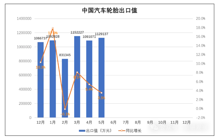 出口130億元!2024年5月我國汽車(chē)輪胎出口量同比增長(cháng)1.1%根據海關(guān)總署發(fā)布的數據,2024年5月,我國新的充氣橡膠輪胎出口75萬(wàn)噸、5638萬(wàn)條、130.4854億元,當月與去年同期相比分別增長(cháng)0.5%、4.8%、2.1%。2024年1-5月,我國新的充氣橡膠輪胎累計出口350萬(wàn)噸、26593萬(wàn)條、617.2911億元,累計與去年同期相比分別增長(cháng)4.3%、9.5%、6.0%?! ∑渲?,5月汽車(chē)輪胎出口66.3753萬(wàn)噸、112.9137億元,當月與去年同期相比分別增長(cháng)1.1%、3.5%?! ?024年1-5月汽車(chē)輪胎累計出口310.0566萬(wàn)噸、529.5500億元,累計與去年同期相比分別增長(cháng)4.4%和6.9%。來(lái)源:新研觀(guān)察(R-11) 2024-06-21 【輪胎】 -